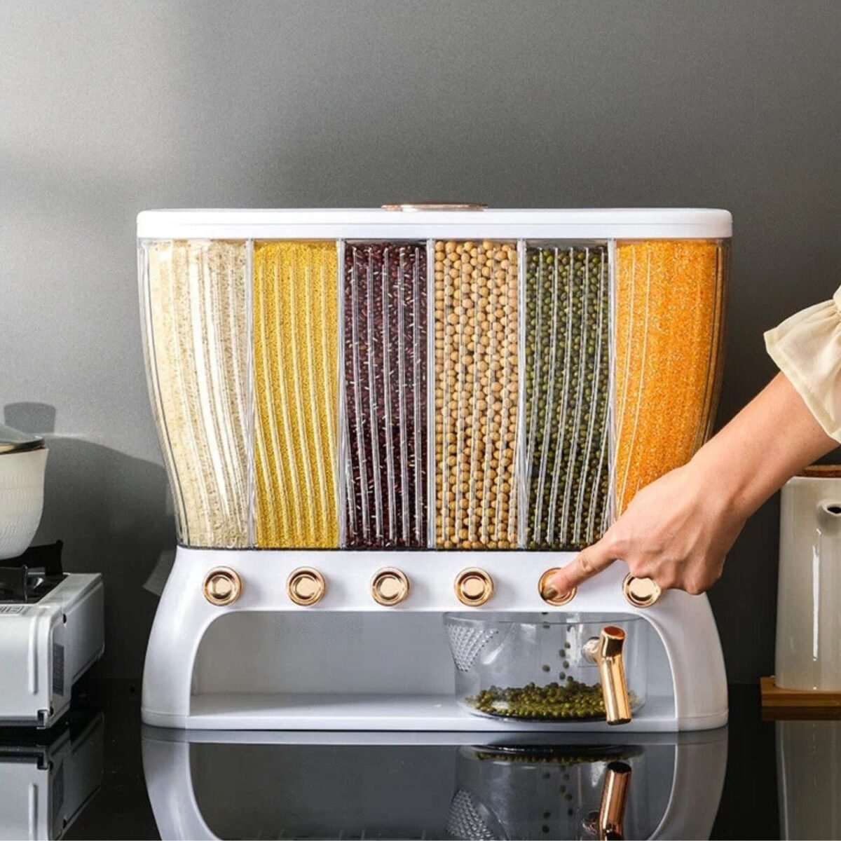 כולל 6 מקומות לאחסון קטניות עם כוס מדידה.