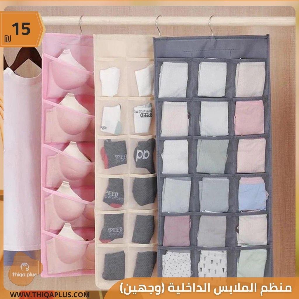 منظم الملابس الداخلية ذو الوجهين مثالي لترتيب الأدوات الشخصية في خزانة الملابس. هذا المنظم مصمم ليستخدم على الوجهين، حيث يحتوي الوجه الأول على 18 فتحة مخصصة للملابس الداخلية والجوارب، بينما يحتوي الوجه الثاني على 6 فتحات للسنتيانات و6 فتحات للجرابات. بفضل هذا التصميم، يمكنك استغلال المساحات وتنظيم الدولاب بشكل فعال. أبعاده هي عرض 40 سم وطول 75 سم، مما يوفر إجمالي 30 فتحة.