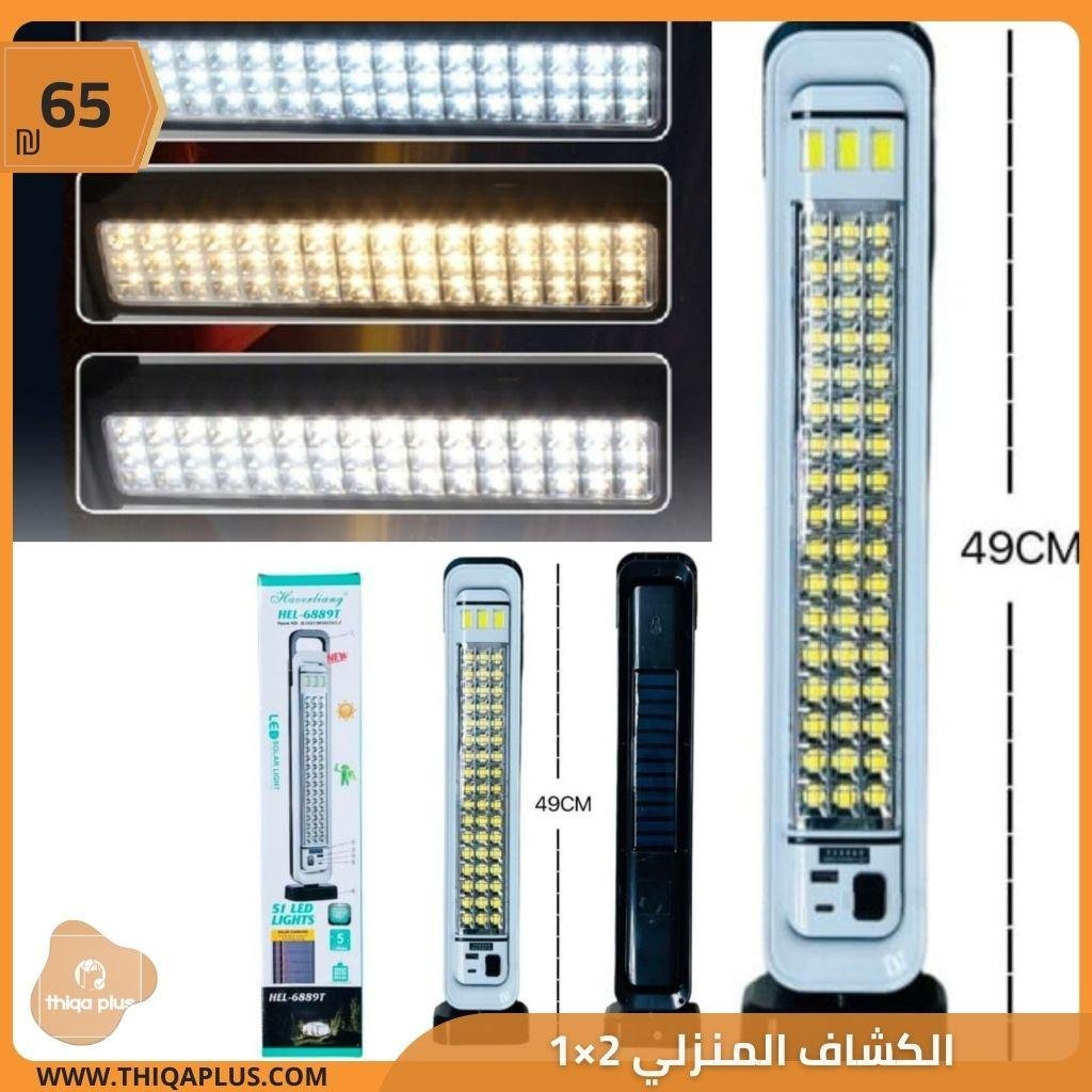 الكشاف المنزلي 2×1 مزود بخيارات شحن متعددة، إما عبر منفذ USB أو الطاقة الشمسية. يحتوي على ثلاثة كشافات أمامية وكشاف LED كبير بقدرة 45 واط و51 لمبة، مع ثلاثة مستويات للإضاءة. يتميز بحجمه المناسب وقوة إضاءته، كما يمكن وضعه على الأرض أو تثبيته على الحائط، بالإضافة إلى مقبض للحمل. يحتوي على مؤشر إلكتروني لمستوى البطارية، ويمكن استخدامه كشاحن للهواتف من خلال وصلة USB. عرض الكشاف 49 سم.